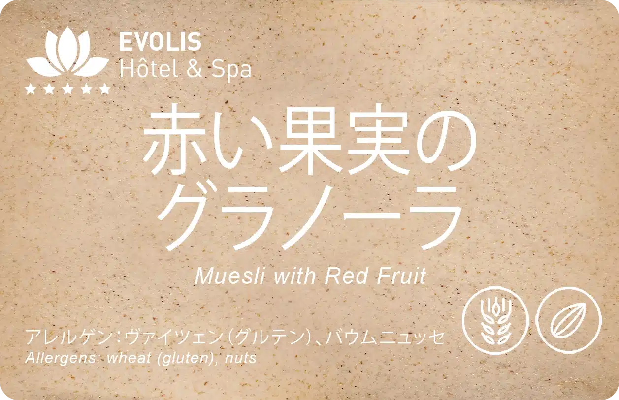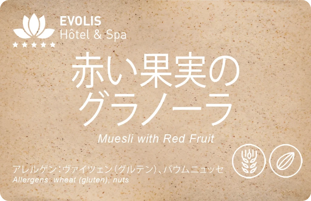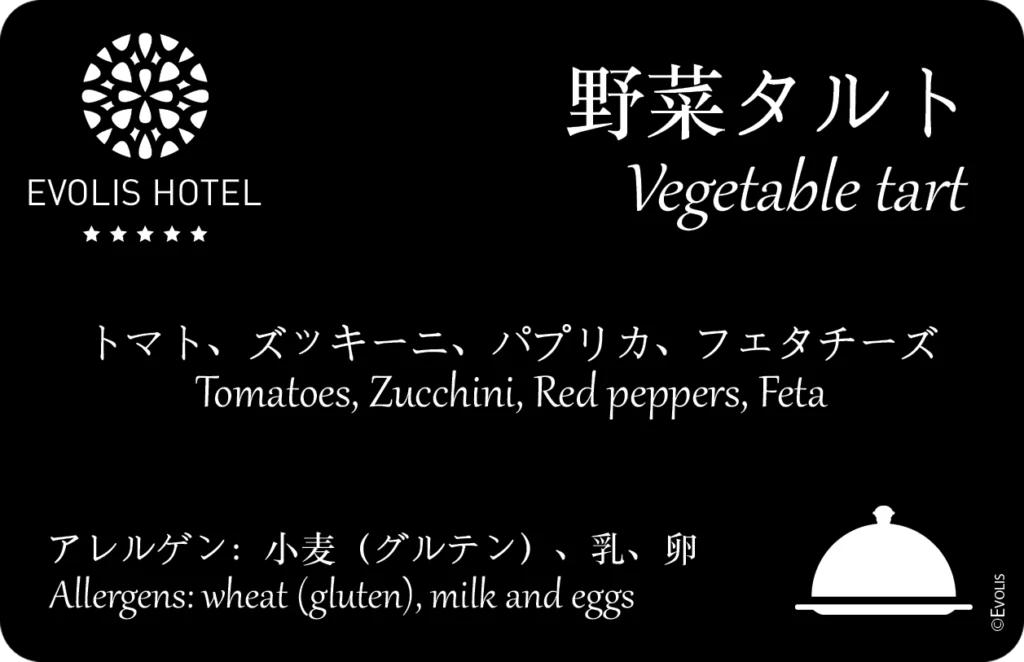 ビュッフェは、メニューや料理、サービスの品質と同様に、明確でエレガントなプレゼンテーションが重要な役割を果たす、ゲストの体験における重要なタッチポイントです。Edikioを使えば、ホテル経営者は、アレルゲンや特別食の必要条件など、必要不可欠な顧客情報を簡単に組み込んだ、明確でプロフェッショナルな多言語ビュッフェラベルを作成・印刷することができます。数回のクリックで、エレガントで耐久性があり、施設のビジュアルアイデンティティと一貫性のあるカードを印刷することができます。国際的な顧客とのコミュニケーションを向上させるだけでなく、食品の安全性と顧客の信頼性を高め、サービススタッフや厨房スタッフがメニューを簡単に変更できるようにします。食品業界向けにデザインされた、高品質で耐久性のある素材に、情報と美観を融合させることが可能です。